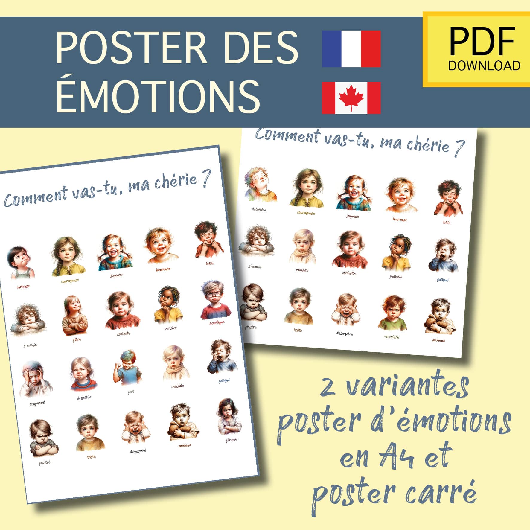 – Affiche des émotions, taille 21 x 21 cm, carré avec 15 émotions